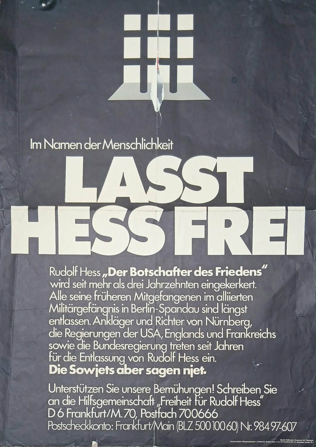 affiche Duitsland - Voor de vrijlating van Rudolf Hess 1977 / groot formaat