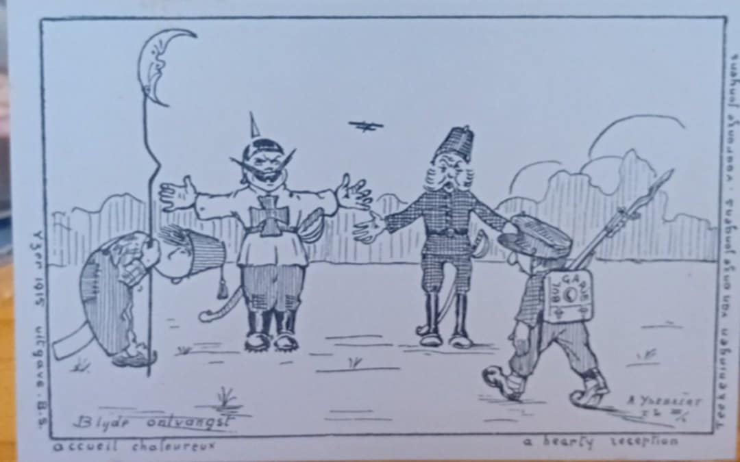 postkaart eerste wereldoorlog belgisch leger 1914 - 1918 - zeer zeldzame anti Duitse spotprent